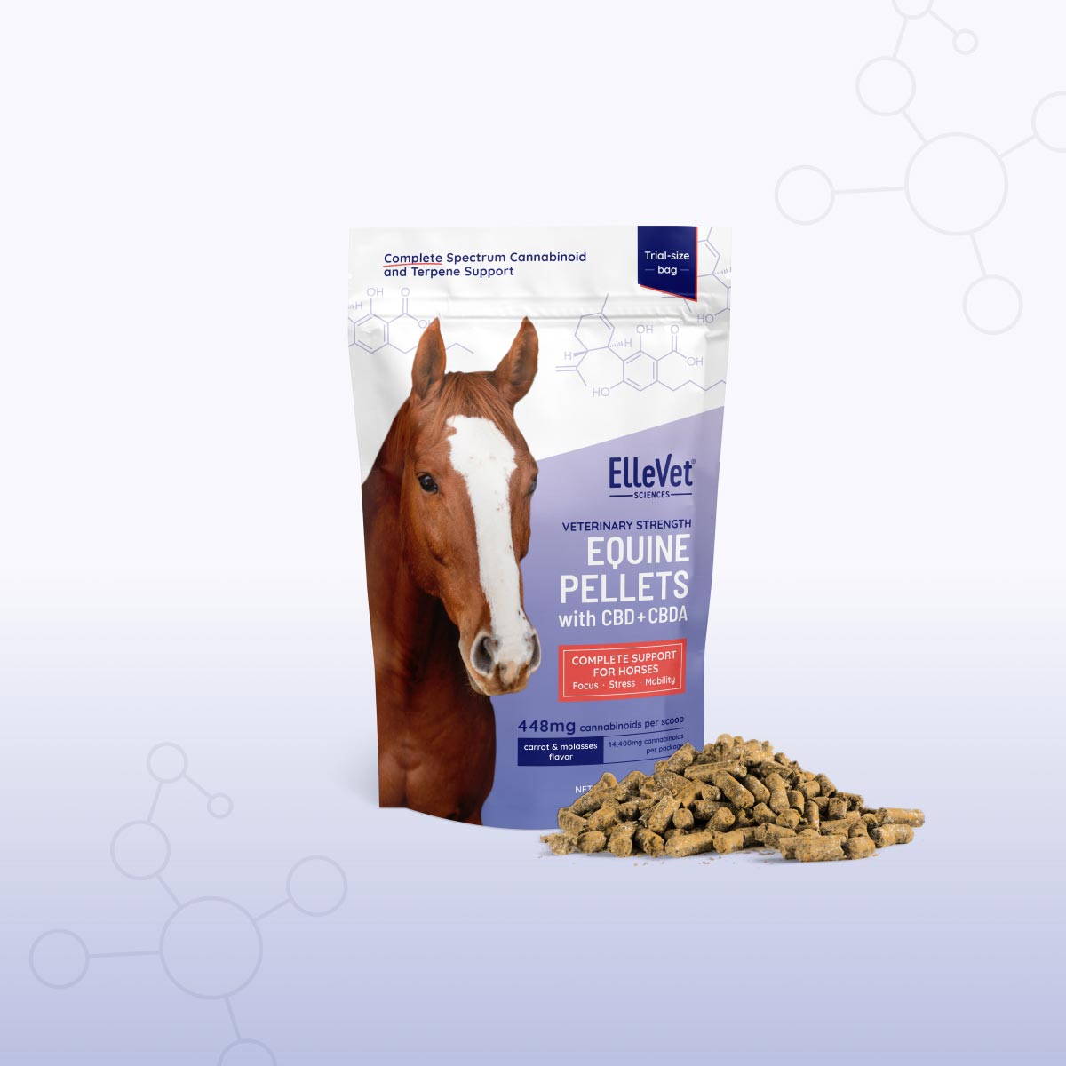 ElleVet Equine Pellets contain 448mg of CBD + CBDA and other minor cannabinoids per scoop. This high concentration of CBD + CBDA provides optimal absorption, which is key to the efficacy of our products. Our innovative equine pellets were developed under strict veterinary oversight, and are backed by two pharmacokinetic and safety studies, plus three pilot efficacy studies.