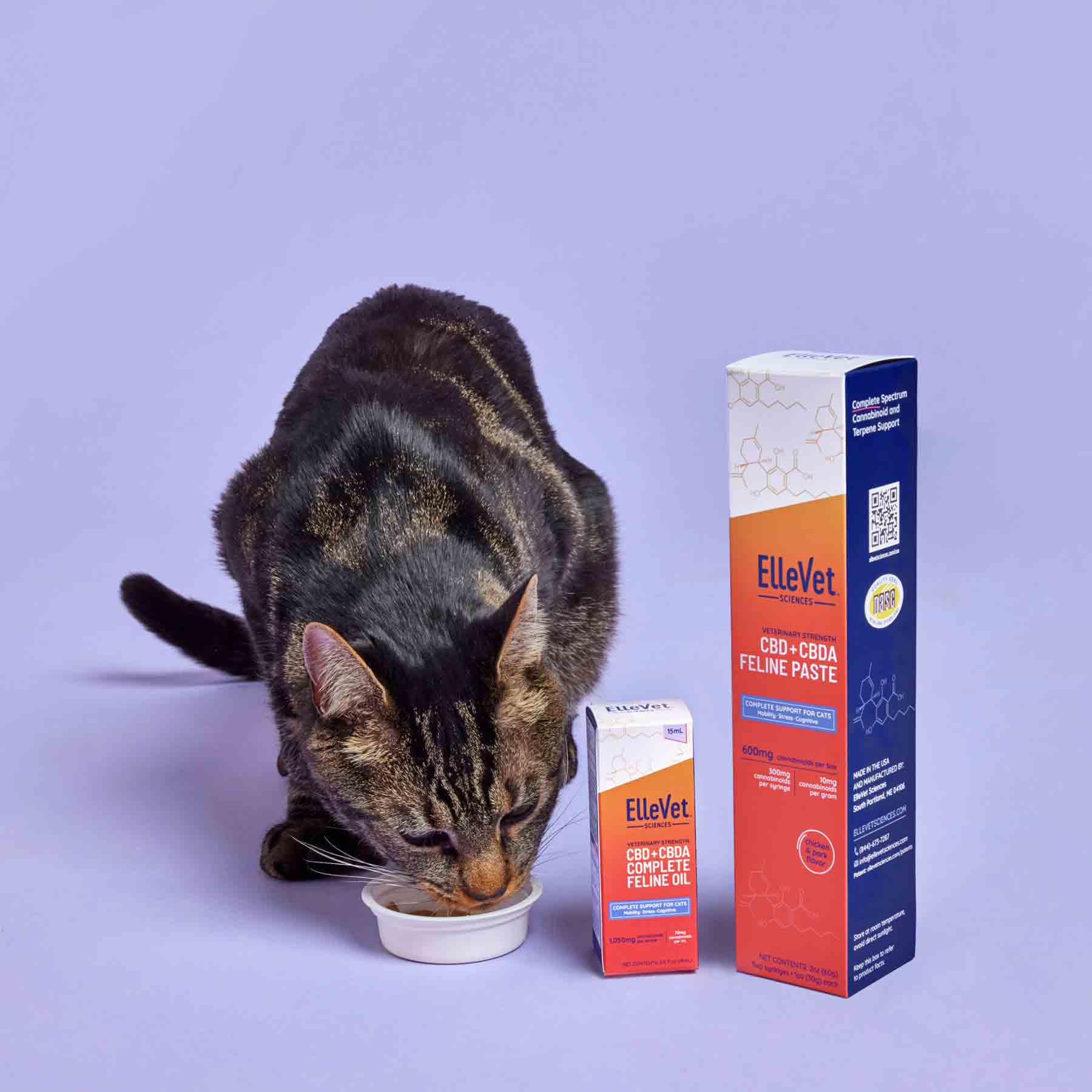 ElleVet Feline Oil is a remarkably effective product for cats, and we are proud to have conducted a long-term safety study to ensure that our product is safe for cats. We learned in our metabolic testing that cats require a higher amount of CBD + CBDA per kg than dogs, so while the oil in our feline product is the same as the oil for dogs, the administration is specific for cats. Cats respond incredibly well to our complete spectrum CBD + CBDA oil. Feline oil has a potency of 70 mg/mL CBD + CBDA.