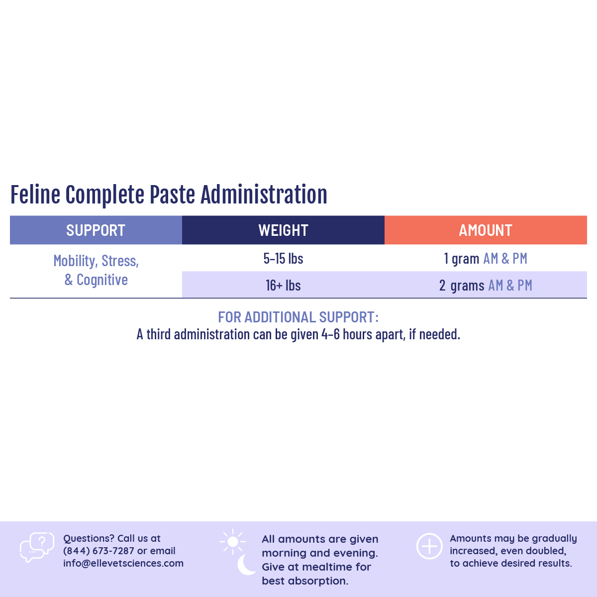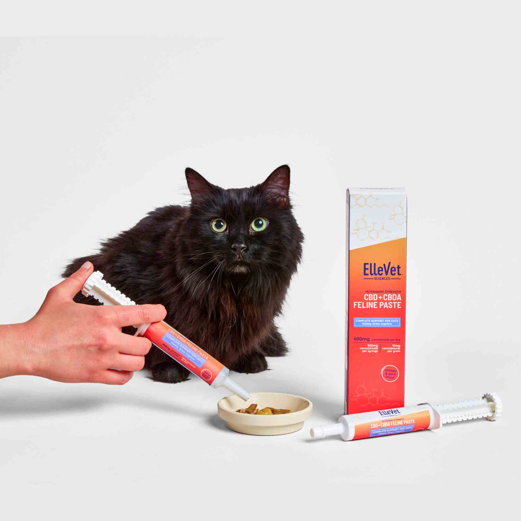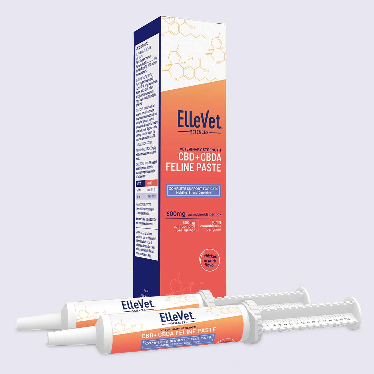 ElleVet’s Feline Complete Paste has been developed specifically for cats, in a chicken and pork flavor that cats love. Feline Paste works extremely well for mobility, stress and cognitive support and is the only feline CBD + CBDA product that has been proven safe in a long-term safety study. The feline paste comes in an easy dial-a-dose syringe, and should be administered with a small amount of food or a treat to help with absorption. Each box contains two syringes (300mg cannabinoids per syringe); each gram contains 10mg of cannabinoids. Cats have very few options for safe and effective relief – we can’t wait for your cat to try the paste and to feel like a kitten again!