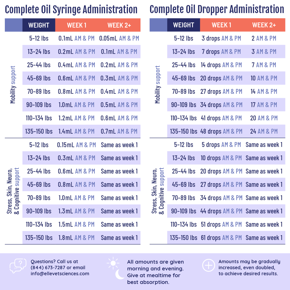ElleVet CBD + CBDA Oil is our original product and the exact blend that is used in our clinical trials. Oils come in three sizes, all with a potency of 70mg/mL CBD + CBDA. Our oils include a syringe or dropper for precise administration, making them a great choice for dogs under 6 lbs. They are also the most economical choice for very large dogs. ElleVet oil can be given with food, administered directly in the mouth, or put in empty capsules that can be added to oil orders. Easy use oral syringe or dropper included with every order.