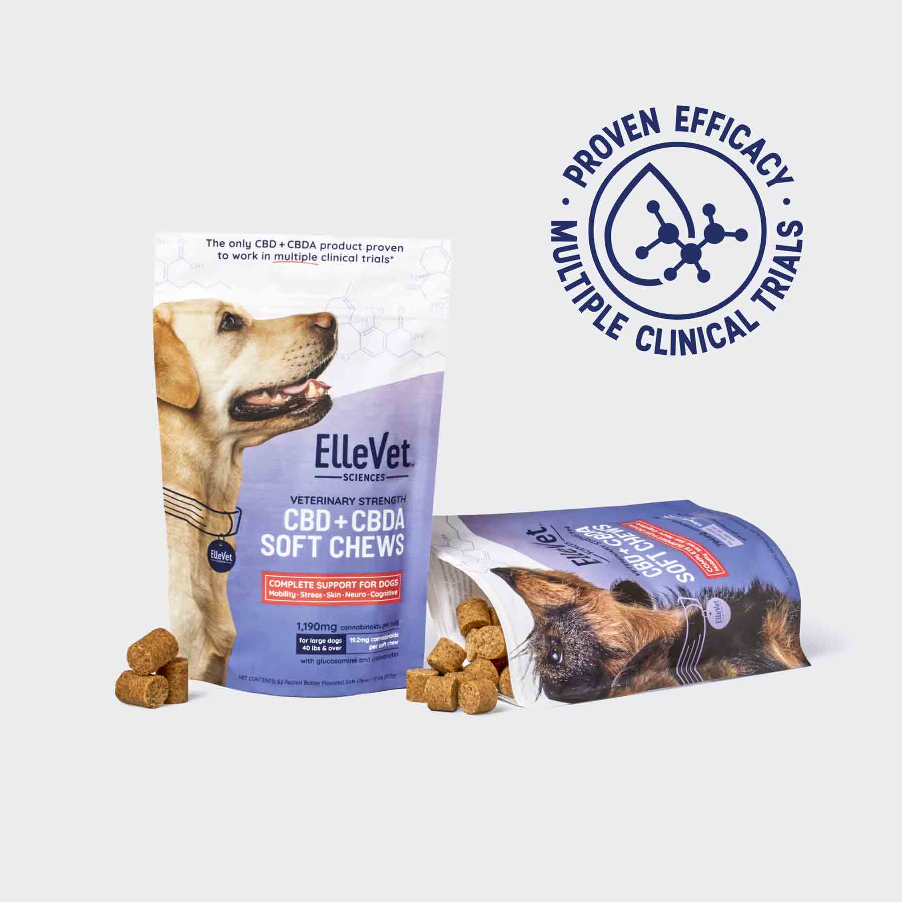 ElleVet CBD + CBDA Soft Chews are a customer favorite! Chews are peanut butter flavored and contain our proprietary oil formulation, as well as added glucosamine and chondroitin. The chews are an easy way to give our product and are very well absorbed. Dogs love them and they are highly effective for joint discomfort, mobility, stress, skin, neuro, and cognitive support.