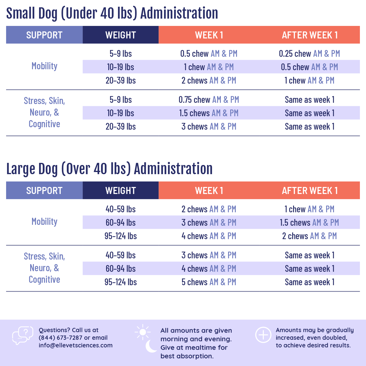 Each large dog soft chew contains 19.2mg of cannabinoids and each small dog soft chew contains 12.8mg of cannabinoids. Each bag contains 62 soft chews.