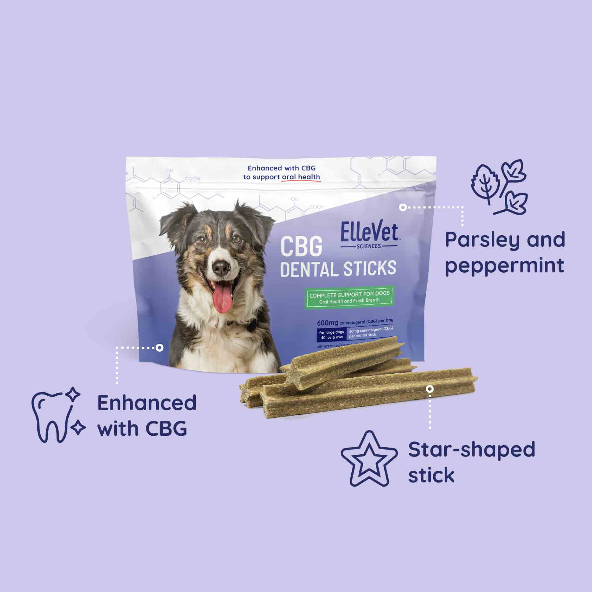 ElleVet’s new CBG Dental Sticks provide your dog with a science-backed, safe, effective option for dental support. CBG supports a healthy balance of bacteria in the mouth, making it a powerful ingredient to support your dog's dental health at any age. CBG Dental Sticks include parsley and peppermint for fresh breath and are formulated in the shape of a star to scrape the surface of the teeth clean of plaque and tartar as dogs chew.